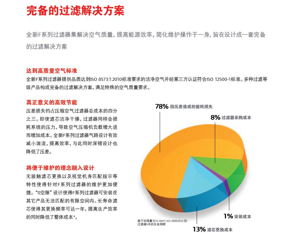 壓差損失約占?jí)嚎s空氣過濾器總成本的四分之三。即使濾芯潔凈干燥,過濾器同樣會(huì)損耗系統(tǒng)的壓力,導(dǎo)致空氣壓縮機(jī)負(fù)載增大進(jìn)而增加成本。全新F系列過濾器氣路設(shè)計(jì)有效減小滿流,提高效率,與此同時(shí)深褶設(shè)計(jì)也降低了壓差。